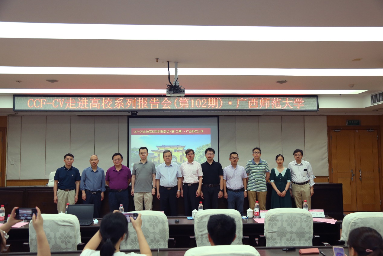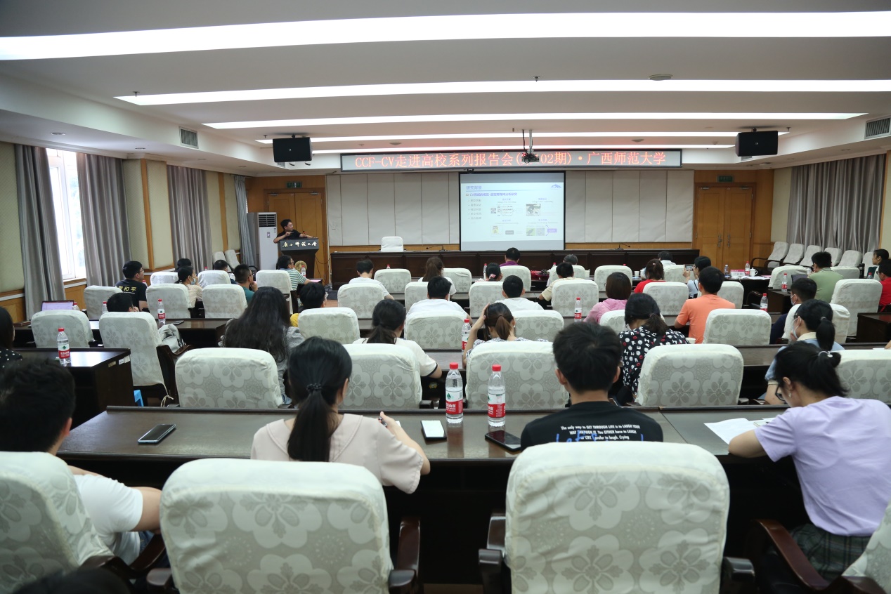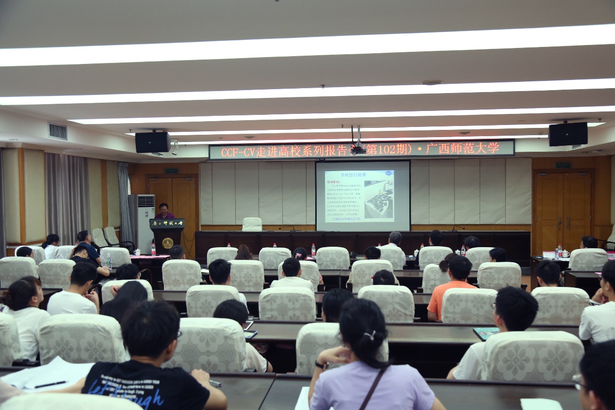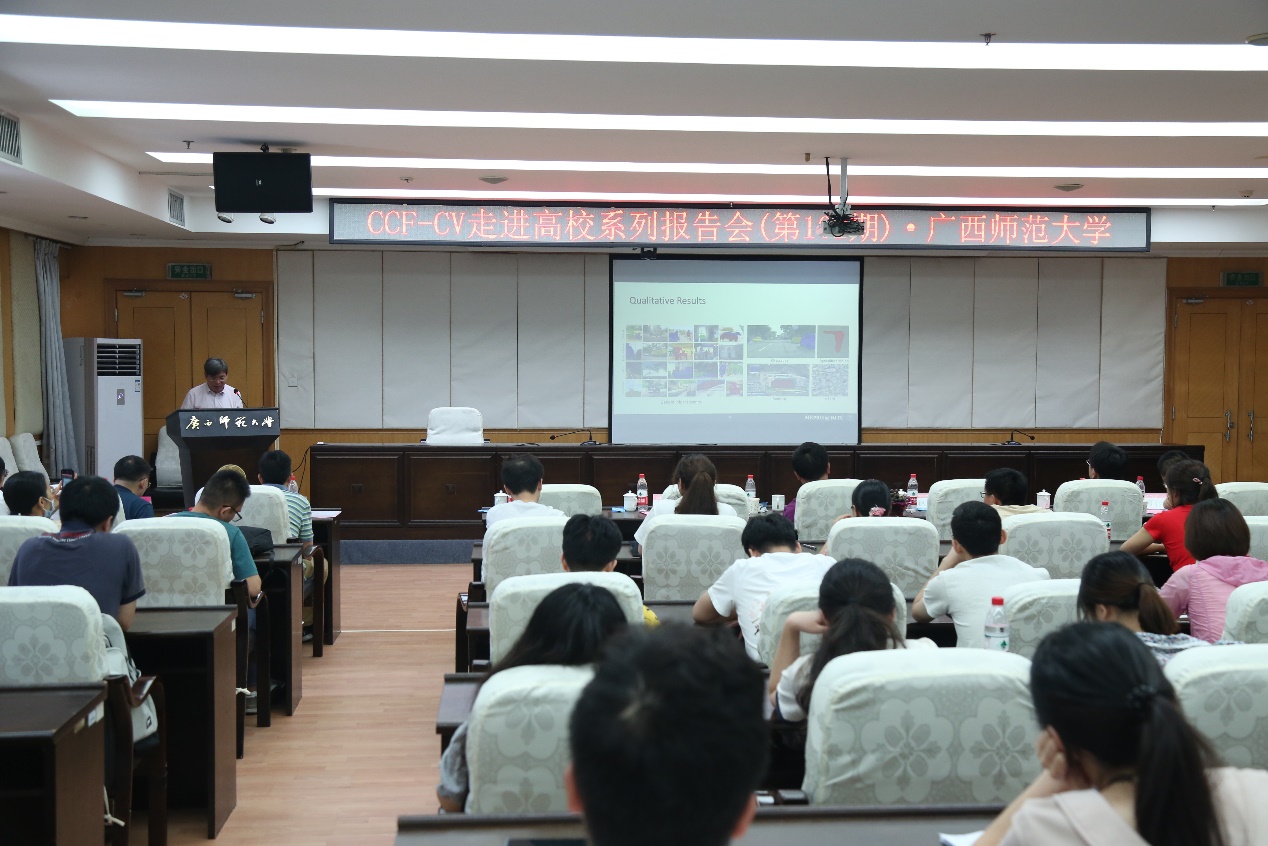 6月11日上午,中国计算机学会计算机视觉专委会(CCF-CV)走进高校系列报告会第102期活动在广西师范大学育才校区图书馆1楼报告厅举行。本次报告会由中国计算机学会计算机视觉专委会主办,广西师范大学计算机科学与工程学院承办。计算机科学与工程学院李先贤教授、唐振军教授、钟必能教授担任本次报告会的执行主席。中国科学院自动化研究所徐常胜研究员和胡卫明研究员、北京交通大学赵耀教授和厦门大学孙晓帅博士作为特邀讲者莅临我校作报告,除计算机学院相关教师及研究生外,还有武汉大学、桂林电子科技大学和桂林理工大学等高校教师以及我校电子工程学院的教师和学生参加了此次报告会。