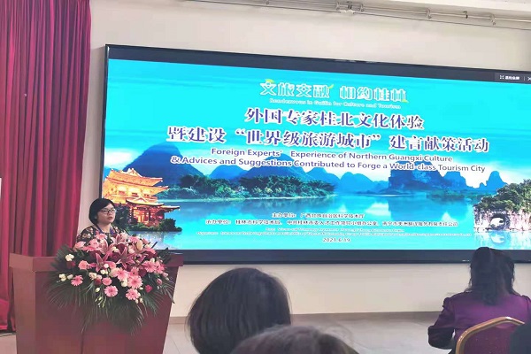 活动伊始,自治区科技厅党组成员姚作芳对来自17个国家的40多名外国专家及工作人员表示热烈欢迎并发言,桂林市科技局党组书记、局长张晓阳对桂林市外国高端人才服务“一卡通”实施细则进行介绍。随后,桂林市各单位的6名外籍专家代表对桂林打造“世界级旅游城市”建言献策。我校历史文化与旅游学院越南籍教师范氏周红简述了自己与桂林的缘分,并对桂林打造“世界级旅游城市”提出建议:通过国内外多媒体平台,加大宣传《印象刘三姐》和《桂林千古情》等优秀文化节目,用两者规模宏大的演出吸引更多的外国人来旅游,更好的讲好桂林故事,中国故事。