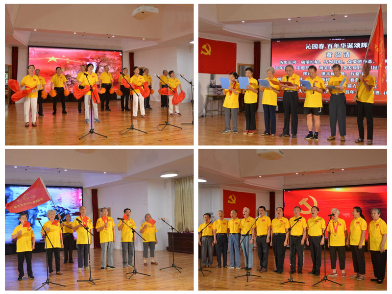 文旅党支部朗诵的毛主席诗词朗诵《沁园春.雪》,表演者基本功扎实,朗诵声情并茂,振奋激昂,荡气回肠,感人肺腑,把诗词的意境表现的显得淋漓尽致。组诗《感党恩 跟党走》、《沁园春.百年华诞颂辉煌》、《庆建党百年华诞》组诗由刘晓、黄绍清、唐高元、吴春斌、柏敬泽、唐高元几名老党员原创。作者上至87岁,当歌当赋,大赞大书,激情绽放,悦动山河,抒写心中对党的无限忠诚和永远热爱。育才南院第一党支部、第二党支部、第三党支部、第四党支部、第五党支部、第六党支部、育才东院党支部、育才北院党支部、离退处退休党支部、纪监退休党支部,以及王城北区芙蓉党支部、王城叠彩党支部、王城东区党支部、王城南区党支部、政经法党支部、王城中区党支部、数学党支部表演了合唱《唱支山歌给党听》、《我们共产党人好比种子》、《解放区的天是明朗的天》、《社会主义好》和京剧《忆秦娥•娄山关》等节目。演出最后全体起立合唱《没有共产党就没有新中国》,形成首尾呼应,将全场氛围推向高潮。老党员们深情倾诉,释放出了深植在每一个老党员心中浓浓的自豪之情,文艺表演就此圆满落下帷幕。