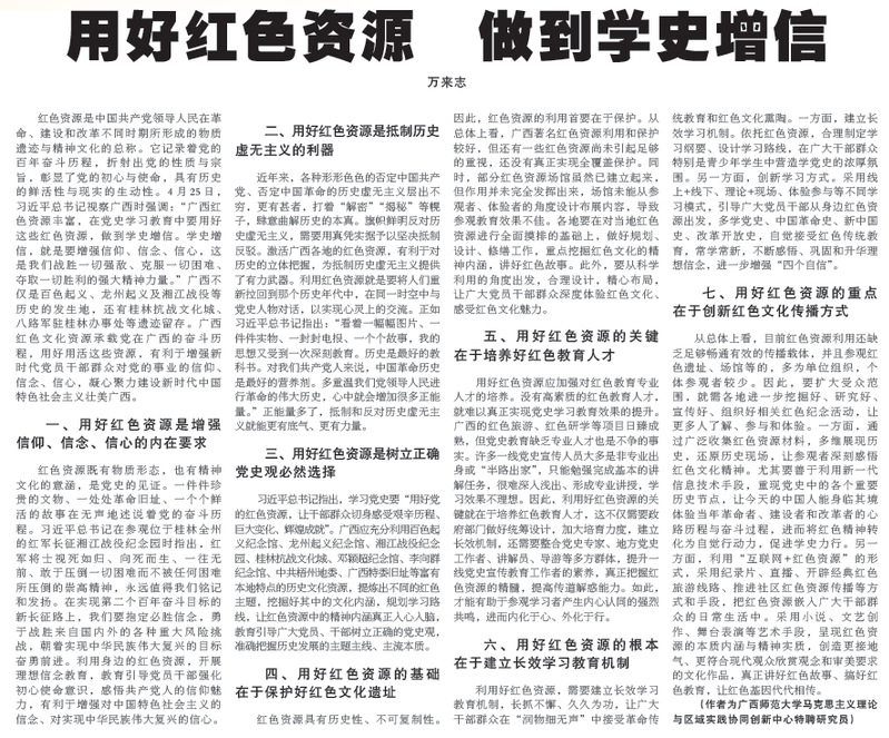 【广西日报】刊发马克思主义学院万来志老师理论文章《用好红色资源 做到学史增信》,获人民网、学习强国关注转载