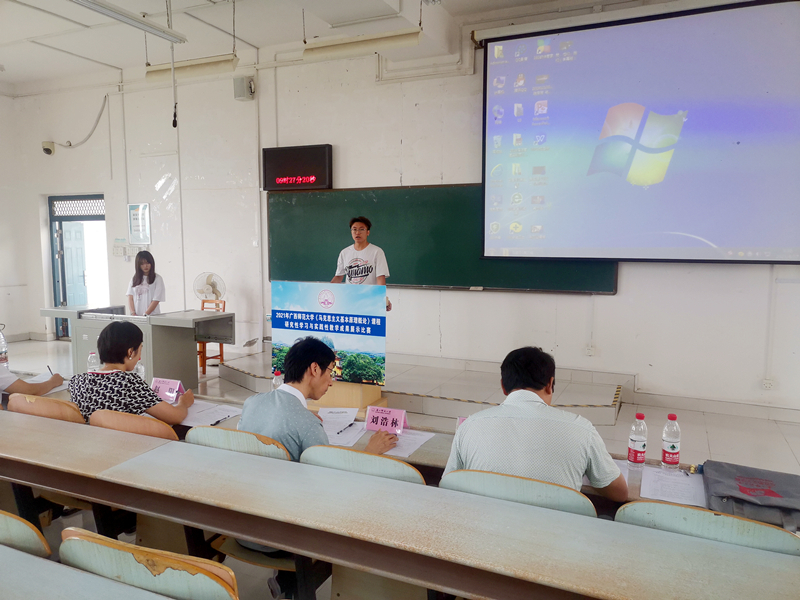 为深入学习习近平总书记在学校思想政治理论课教师座谈会上的重要讲话精神,更好地发挥思想政治理论课作为高校落实立德树人根本任务的关键课程作用,进一步检验大学生思想政治理论课堂的教学成果。6月27日上午,由广西师范大学主办、马克思主义学院承办的2021年广西师范大学思政课研究性学习与实践性教学成果展示竞赛活动在雁山校区举行。本次比赛按思政课的4门课程《马克思主义基本原理概论》、《毛泽东思想和中国特色社会主义概论》、《中国近现代史纲要》以及《思想道德修养和法律基础》进行,每门课程由5位教学经验丰富的教师担任评委。比赛分现场展示和评委提问两个环节,选手现场展示思政课研究性学习和实践性成果,评委进行现场提问。所有参赛队伍按照现场抽签的顺序在规定的时间内依次上台进行成果展示。