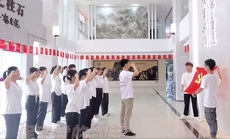 在集中观看庆祝中国共产党成立100周年大会后,学院党委副书记带领新发展党员进行入党宣誓,全体党员同志共同重温入党誓词。面对鲜红的中国共产党党旗,学院党委副书记庄重举起右拳,带领54名新党员庄严宣誓:“我志愿加入中国共产党,拥护党的纲领……随时准备为党和人民牺牲一切,永不叛党。”一字一句,神圣豪迈,铮铮誓言,表达了为共产主义事业奋斗终生的决心。