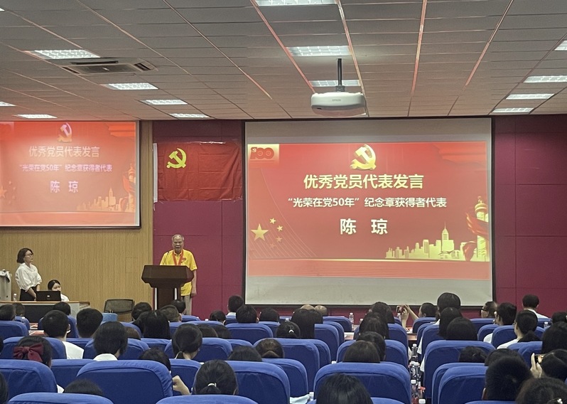 “光荣在党50年”纪念章获得者代表陈琼老同志在发言中结合自身奋斗经历深情回顾了中国共产党百年奋斗的光辉历程,他说,是党和国家培育了他,造就了他,他非常感谢党和国家对科研人员的关怀,深切感受到了没有共产党就没有新中国、就没有今天的幸福生活,自己作为共产党员,将依旧退休不褪色,继续保持共产党员该有的本色。同时寄语在座党员,牢记初心,关心国家大事,心系家国,希望在座的青年党员,努力学习,向科研进军,积极锻炼身体,争取在50年后也能跟他一样获得“光荣在党50年”纪念章。