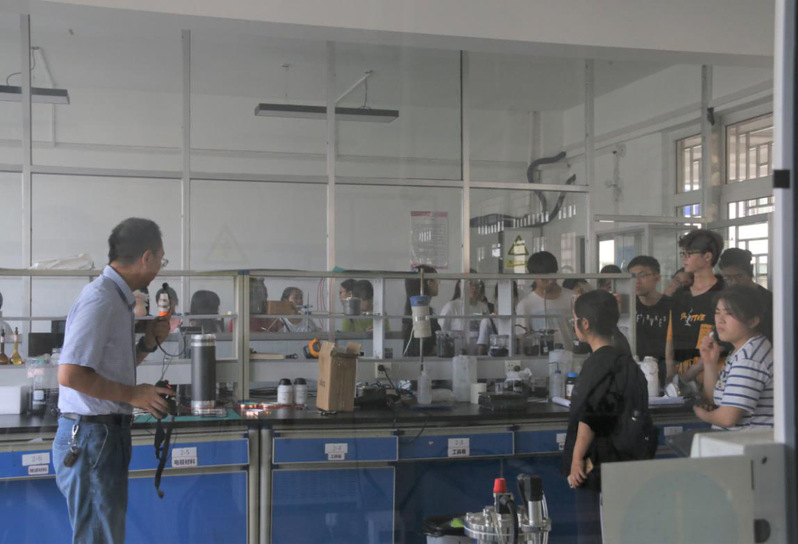 新能源船舶电池工程技术中心的老师带领同学们参观科研实验室