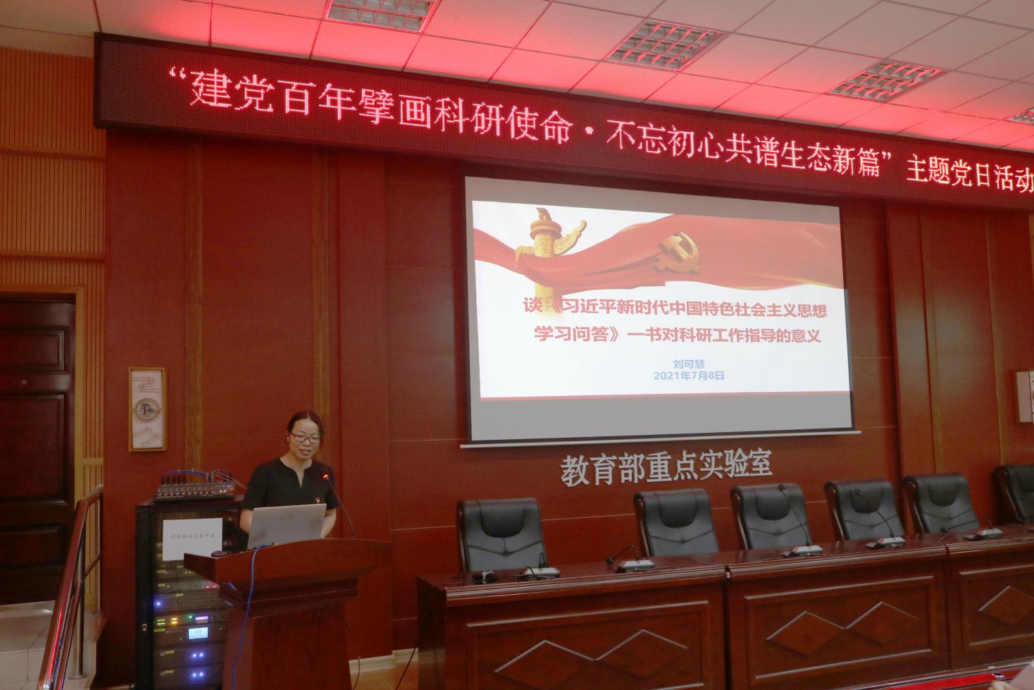 随后,刘可慧教授讲授题为“谈《习近平新时代中国特色社会主义思想学习问答》一书对科研工作指导的意义”的微党课,微党课对本书内容的概括进行介绍,选取书中典型案例进行剖析,指明该书对我们在科研选题和科技论文写作上所具有的重要指导意义,建议与会同志可研读改书,以该书中的理论武装我们的头脑,指导我们科研的方向。与会同志纷纷表示,将以本次微党课为契机,以扎实态度投身于学校、学院建设和科研任务中,着力在激发科研队伍活力、增强科技发展动能、提高科研高水平成果产出上下功夫。最后,唐三淇、官晓金同学作为各年级研究生党员代表上台发言,就学习“习近平总书记在庆祝中国共产党成立100周年大会上的重要讲话精神”结合做为一个生态人应具有的历史使命进行分享,立下“不负韶华,强国有我”的铮铮誓言。