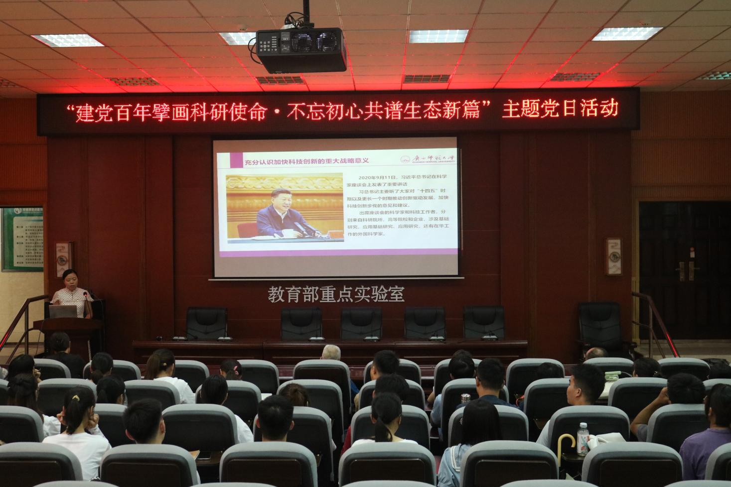 会议伊始,主持人带领在场同志学习“习近平总书记在庆祝中国共产党成立100周年大会上的重要讲话精神”和“习近平总书记在科学家座谈会上的重要讲话精神”的文件,并号召与会同志切实把思想和行动统一到习近平总书记的重要讲话精神上来,为加强生态文明建设、建设新时代中国特色社会主义壮美广西、全面建设社会主义现代化强国和实现中华民族伟大复兴的中国梦而不懈奋斗。接着,主持人带领与会同志集体观看刘可慧教授在“2021年广西师范大学优秀科研工作者代表慰问座谈会”的发言视频,号召广大师生向优秀科研工作者学习,为争做科学精神弘扬者、科技知识传播者、自主创新引领者而砥砺奋进。