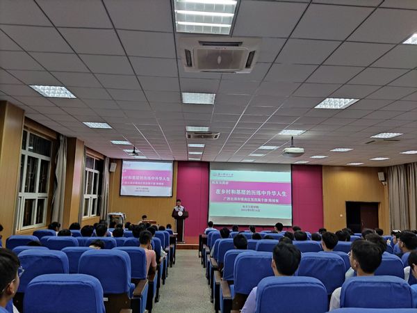 交流会由我校2007级计算机科学与技术专业(专升本)毕业生、广西北海市银海区发改局干部陈祯有同志主讲,他以“在乡村和基层的历练中升华人生”为主题,简要回顾了其毕业11年来的5段工作经历,重点分享从担任大学生村官到担任脱贫攻坚(乡村振兴)工作组组长共8年不同寻常的“村官”经历,生动展现了其真扶贫、扶真贫,与困难群众结下深厚感情的鲜活情景,深情勉励同学们树立正确的职业价值观,认认真真学习,积极参加社会实践,将来到基层一线和祖国最需要的地方去建功立业。