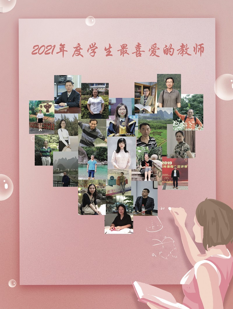 经班级推荐、各学院(部)推荐、学校复核、获奖公示四个环节,文学院/新闻与传播学院莫其逊、历史文化与旅游学院张娟、马克思主义学院莫梨、法学院李庆灵、政治与公共管理学院陈泉、经济管理学院吴朝晖、教育学部闫若婻、外国语学院崔凯、美术学院王宇鹏、音乐学院何娟娟、数学与统计学院马林涛、物理科学与技术学院刘小兵、化学与药学学院唐劲军、生命科学学院骆海玉、环境与资源学院张杏辉、计算机科学与工程学院/软件工程学院陆遥、体育与健康学院韩延柏、电子工程学院陆志敏、职业技术师范学院连智平、设计学院吴少昆、国际文化教育学院唐蕾共21名教师被评为广西师范大学2021年“学生最喜爱的教师”。