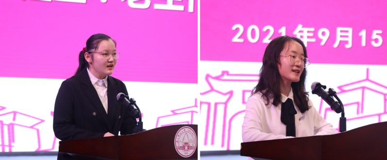 2018级在校生代表宗清瑶对2021级新生表示热烈欢迎,她提到“大学是梦想开始的地方,我们只有脚踏实地、努力拼搏,才能够将梦想变为现实。”2021级本科新生杨思怡代表同学们表示对学校及学部的感谢,并表示要拿出为民服务“孺子牛”的干劲、创新发展“拓荒牛”的闯劲、艰苦奋斗“老黄牛”的韧劲,甘当人梯,努力成为四有好老师,将来为教育事业贡献出自己的力量。