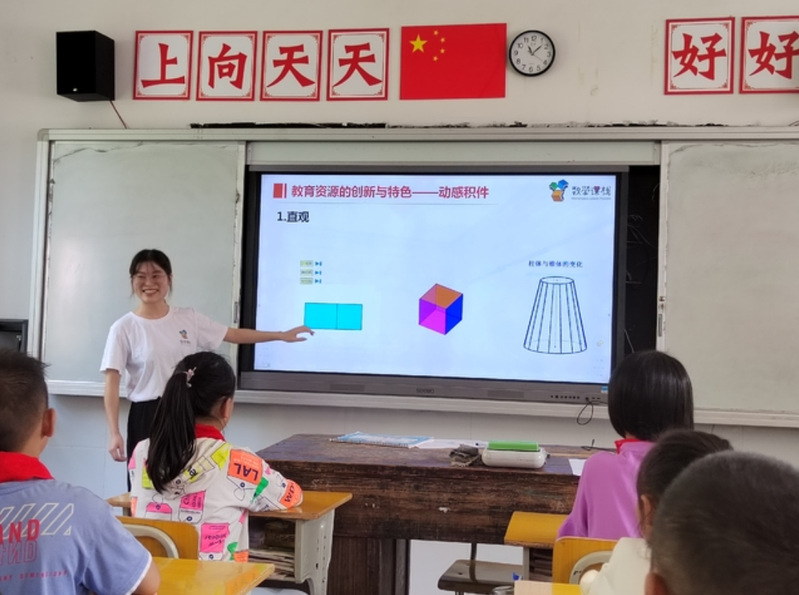 当天,广西师范大学“数学课栈”团队成员利用“数学课栈”微课资源,为两所小学的教师和孩子们带来了一堂生动有趣的教学课。“数学课栈”是一个紧密对接高师数学教育研究与基础教育数学教学实践的公益平台。近三年来,团队通过“数学课栈”的“圆梦计划”和“培雁工程”公益项目;通过送教下乡、送培到校、网络研修等方式,开展公益活动300余场,500多所乡村中小学学校受用,100多万师生受益。培养了来自全国各地3000余名优秀大学生志愿者,参与帮扶了5000多名乡村中小学生,为乡村孩子自主学习提供良好的学习平台,更重要的是直接服务和改善乡村中小学数学教师的教学,极大弥补乡村数学教育的资源匮乏和改善了乡村数学教师教育观念和方法。