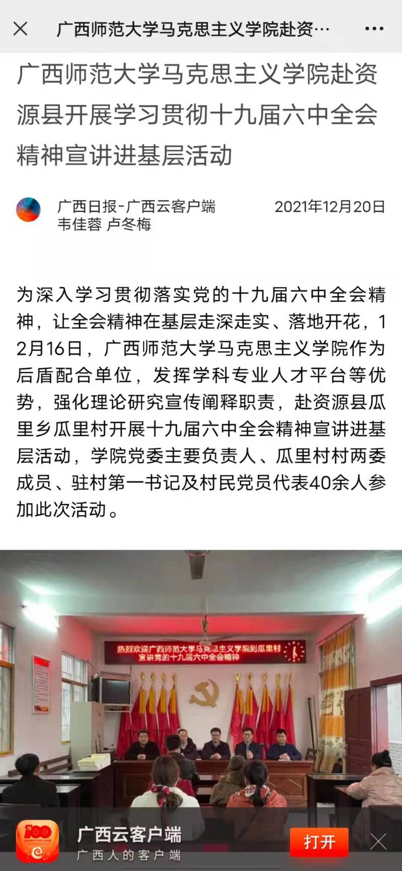 12月20日,广西日报-广西云客户端以《广西师范大学马克思主义学院赴资源县开展学习贯彻十九届六中全会精神宣讲进基层活动》为题,关注报道12月16日我校马克思主义学院赴资源县瓜里乡瓜里村开展十九届六中全会精神宣讲进基层活动。马院作为后盾配合单位以强烈的政治自觉、思想自觉和行动自觉,深入基层开展理论宣讲,推进全会精神飞入寻常百姓家,打通理论传播“最后一公里”,充分发挥全国重点马克思主义学院在讲好党的理论政策上的示范引领辐射带动作用。