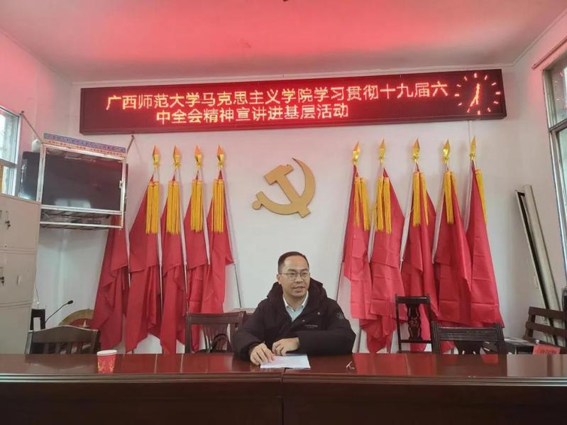 为深入学习贯彻落实党的十九届六中全会精神,让全会精神在基层走深走实、落地开花,12月16日,广西师范大学马克思主义学院作为后盾配合单位,发挥学科专业人才平台等优势,强化理论研究宣传阐释职责,赴资源县瓜里乡瓜里村开展十九届六中全会精神宣讲进基层活动,学院党委主要负责人、瓜里村村两委成员、驻村第一书记及村民党员代表40余人参加此次活动。
