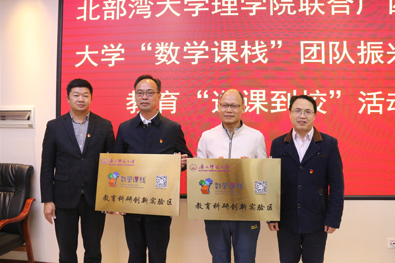 广西师范大学数学与统计学院党委负责人介绍“数学课栈”团队近年来服务社会的基本情况,他指出,学院一直不忘“立德树人”的初心,坚守服务乡村教育的使命,期待与各地院系单位和教育主管部门协同助力乡村数学教育振兴。北部湾大学理学院教师代表从教学与科研相互促进的角度指出本次活动的重要意义,他希望各实验基地学校用好、用活“数学课栈”资源,进一步提升上思县数学教育教学质量。随后,广西师范大学数学与统计学院党委负责人为上思县教育局、北部湾大学以及上思中学、上思县实验中学等11所县级学校分别授予“广西师范大学数学课栈教育科研实验区”和“广西师范大学数学课栈教育科研创新基地”的牌匾并捐赠“数学课栈”优质教育资源。上思县教科局党组书记、局长对广西师范大学“数学课栈”团队所送来的优质资源表示感谢,并表示将会督促各实验基地学校充分用好课程资源,为上思县的教育事业做出贡献。