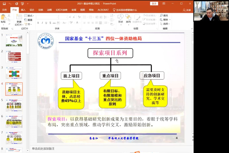 国家杰出青年科学基金获得者、华南理工大学朱长江教授应邀通过线上的方式举行《基金申报之我见》讲座。朱长江教授详细讲解国家自然科学基金项目申报书的撰写及注意事项,并通过图表的形式展示申报书的基本框架,从摘要、关键词、项目组成员、经费预算、立项依据、研究内容、研究基础、工作条件等方面逐一分享经验。