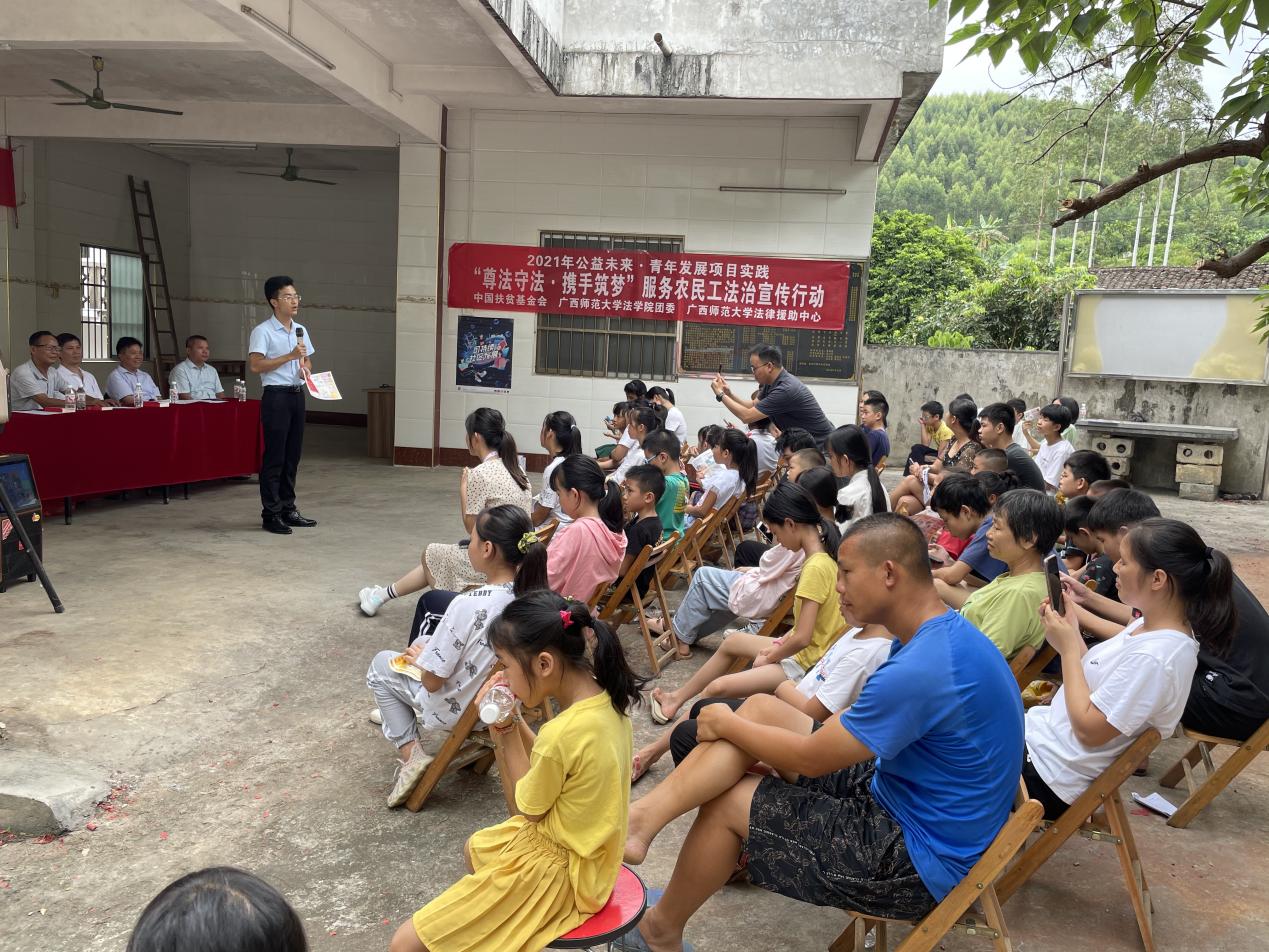 为响应乡村振兴战略,加强农民工的法治宣传教育,维护农民工合法权益,法律援助中心积极开展“尊法守法·携手筑梦”服务农民工法治宣传行动,前往桂林市荔浦市、资源县、临桂区、南宁市武鸣区等4县(区)开展现场咨询、普法宣传、农民工子女关怀等活动,并借助基层工会开展法治讲座,邀请专家学者、律师等围绕就业、劳动合同、劳动争议调解仲裁、社会保险、婚姻等就业、劳动相关的法律法规进行法治宣传,发放各类宣传资料1000余份,累计服务群众逾600人次。本系列活动通过“校地联动”,发挥法学专业优势,旨在为广大农民工提供法治宣传服务,为农民工子女送上公益关爱,以法律援助守护农民工的合法权益,以法治之光促进乡村振兴,获得法学院2021年度“信德嘉奖学金”“同望奖学金”专业实践基金支持,获评广西师范大学学生社团重点项目、“公益未来·青年发展”社会实践十强项目,得到桂林电视台的采访宣传报道。