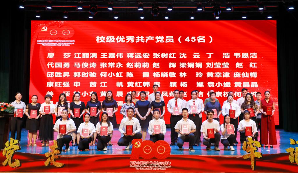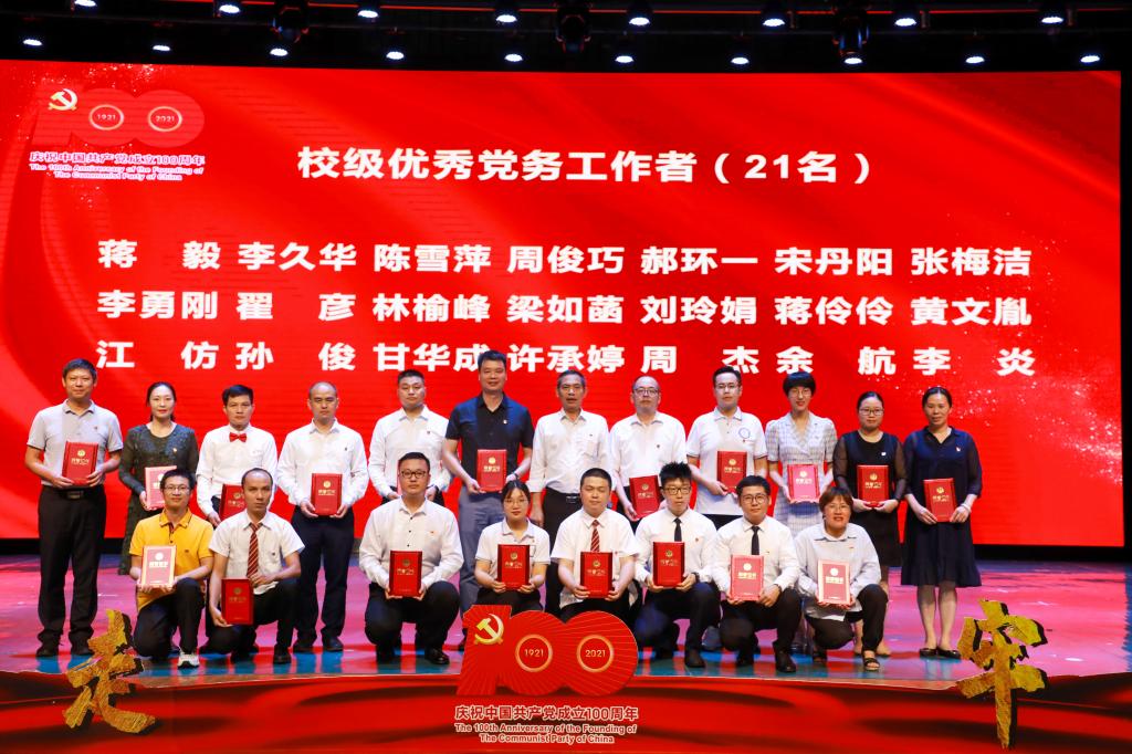 副校长宣读关于表彰桂林学院先进基层党组织、优秀共产党员和优秀党务工作者的决定。校党委书记、校长、副校长分别为先进基层党组织、优秀党务工作者、优秀共产党员颁奖。