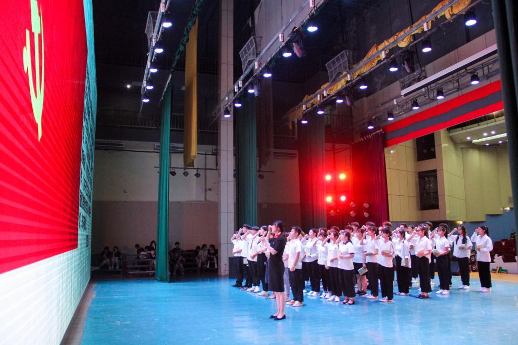 校党委书记唐为新发展的党员代表赠送党史学习教育书籍,并带领新党员代表庄严宣誓