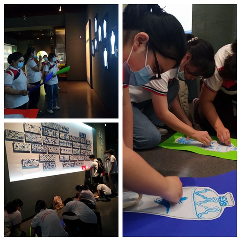 接着走进了桂林出土明代梅瓶陈列馆。据介绍,桂林博物馆珍藏300多件梅瓶,其中250余件是以明代青花为主的瓷梅瓶,60余件为陶梅瓶。这些梅瓶绝大部分出自明靖江王陵区,它们造型丰富,釉色多为青花,纹饰亦绚丽多样。许多专家学者对此推崇备至,誉之为“国之瑰宝”,“集明代梅瓶之最”,“梅瓶之乡,桂林一绝”。梅瓶丰富了桂林的城市内涵,使桂林拥有山水甲天下和梅瓶甲天下两顶桂冠。同学们一边认真参观,一边与讲解员互动,详细了解这些文物的来源、历史、造型、纹饰等,还有许多同学一边参观,一边用画笔描绘了梅瓶独具魅力的纹样,最后,大家分享了自己的心得体会。
