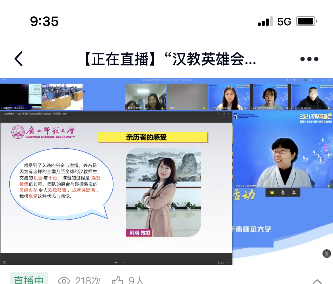 历时两个多月的2021“汉教英雄会”国际中文教学技能全国交流活动在各片区及全国层面成功举办,各院校团队紧扣时代发展趋势,扎根国际中文教育沃土,以高涨的热情与精湛的技能,展示了多样立体的教学成果,有力彰显了新时代汉语国际教育学科建设取得的新成绩。我校在中南片区24所高校的教学团队中表现突出,作为全国30所院校团队之一在云端向全世界汉语国际教育的师生们分享教学理念、展示团队风采,体现出我校文学院与国际文化教育学院教师们不俗的教学理论素养、高超的教学技能与教学设计能力。