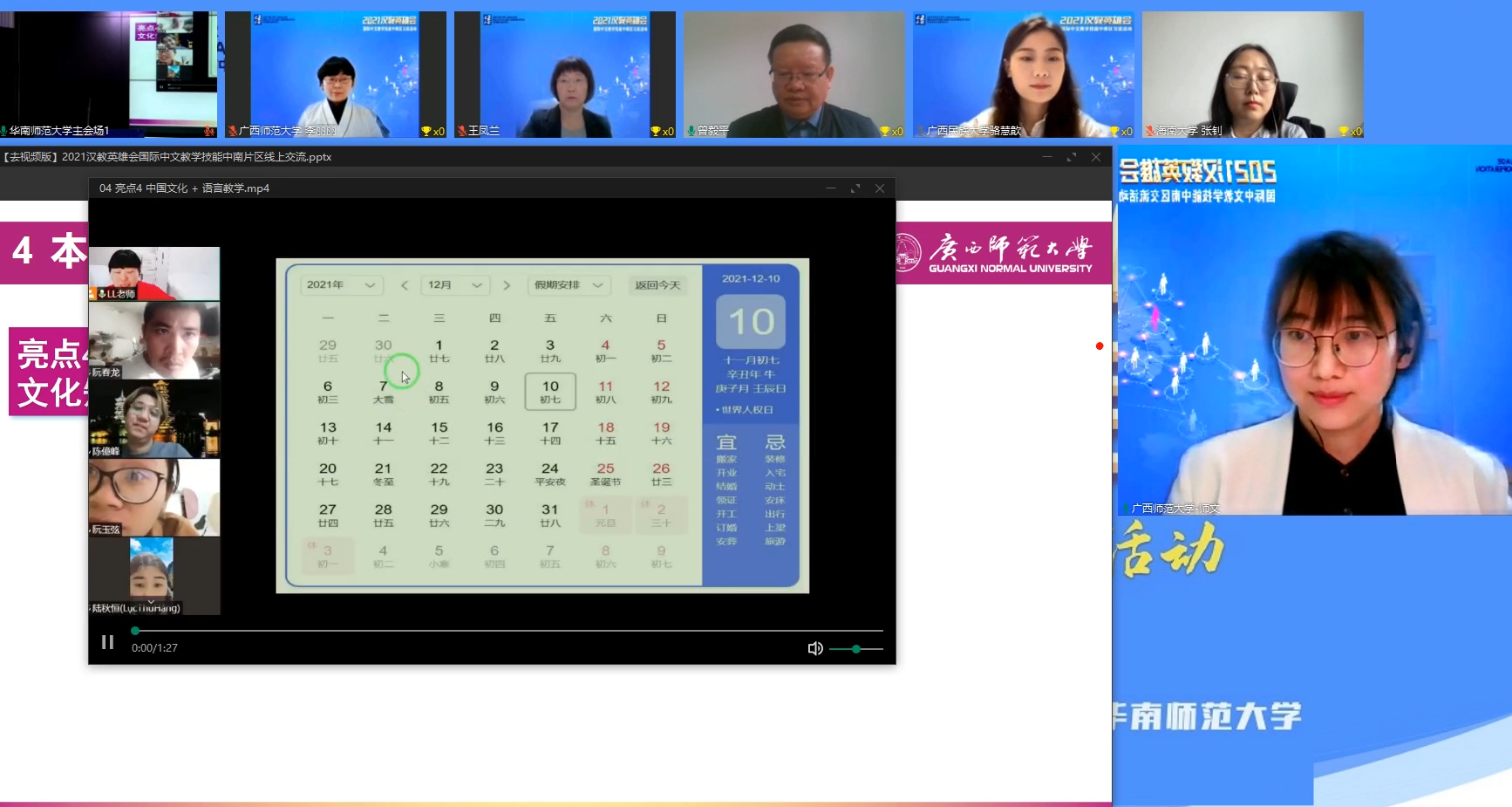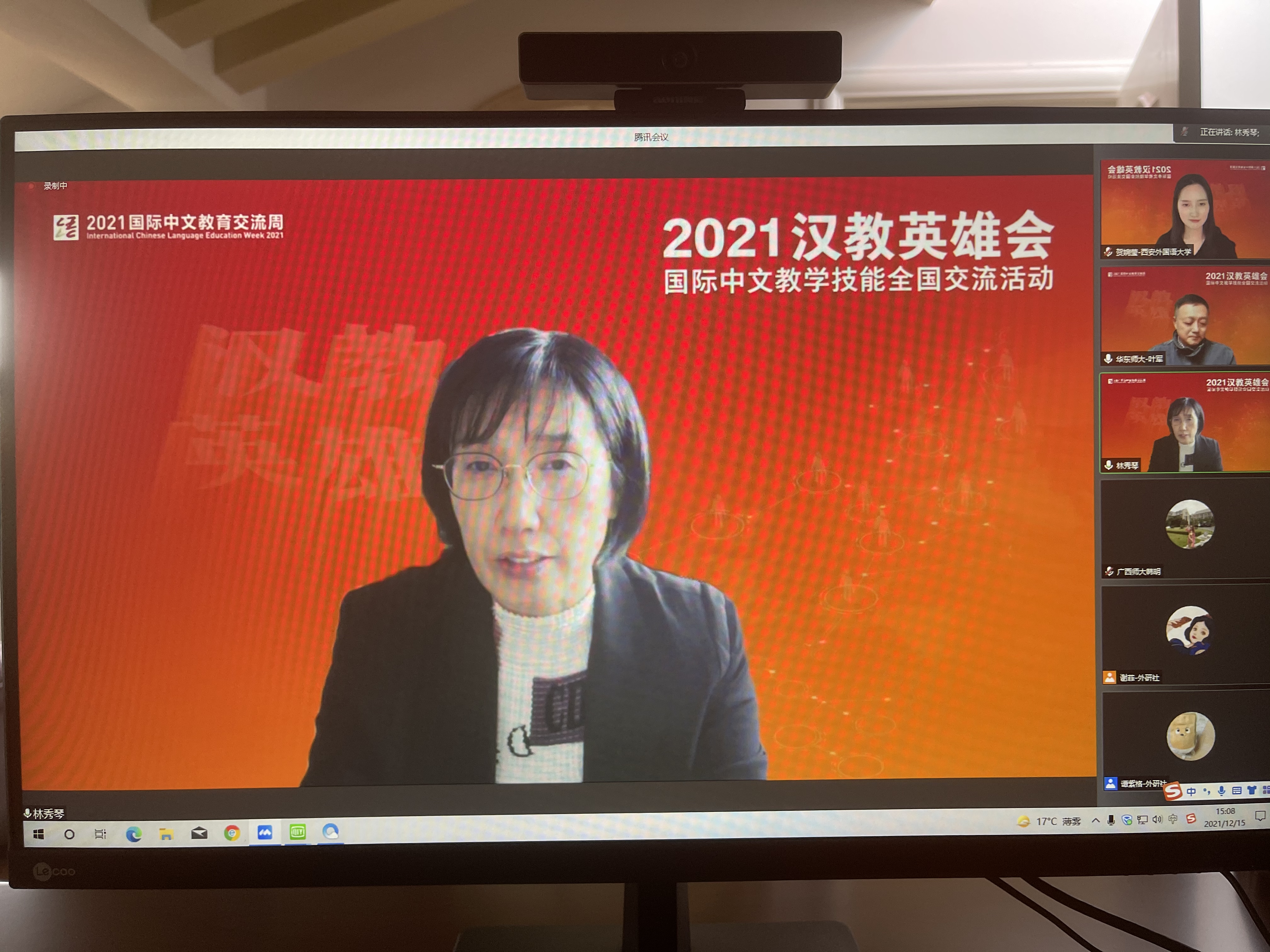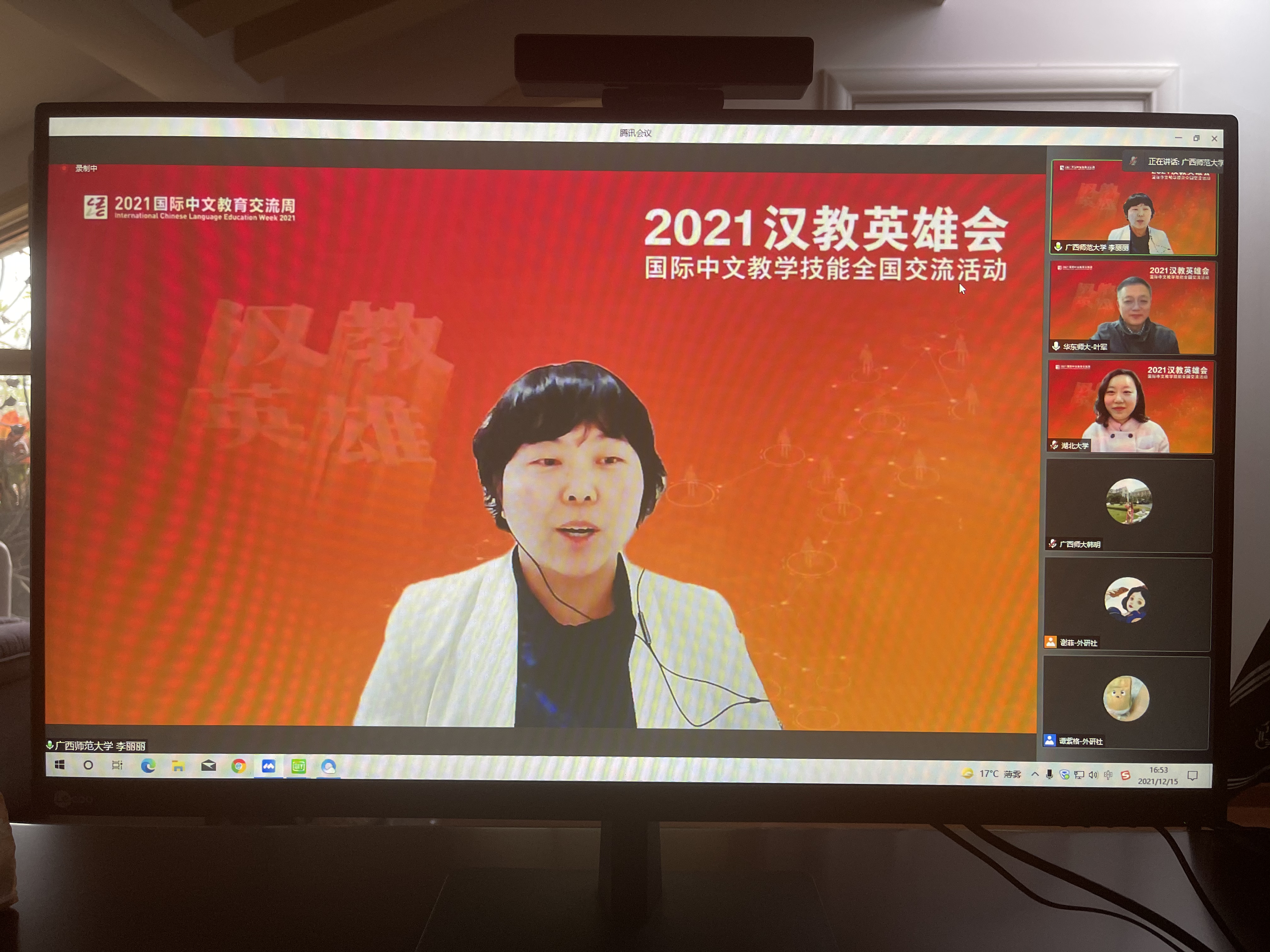 我校文学院的韩明教授作为团队负责人,与国际文化教育学院的李丽丽老师、李芳老师、师文老师和焦小玲老师组成了“广西师范大学汉教群英会”教学团队。我校教学团队由韩明教授负责教学指导与团队协调,来自国教院的四位汉语教师负责录制教学视频、提交报名材料等工作。经过中南片区专家的评审与选拔,我校教学团队提交的教学视频及教学设计从中南片区24所院校中脱颖而出,成功进入全国国际中文教学团队30强,并于2021年12月16日参加了2021“汉教英雄会”全国层面的线上国际中文教学技能交流活动。本场交流展示会以“数字化教学手段与初级中文教学”为主题,由华东师范大学叶军教授担任主持,北京语言大学姜丽萍教授和首都师范大学林秀琴副教授出任点评嘉宾。李丽丽老师代表我校教学团队在本场交流活动上展示了教学设计及视频所提托的课程资源,课程设计中突出交际功能的特征以及在线课程体系化资建设得到了会场点评嘉宾的高度赞扬。