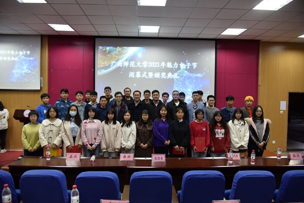 出席“魅力电子”科技文化节的嘉宾、领导、老师与获奖学生代表合影留念
