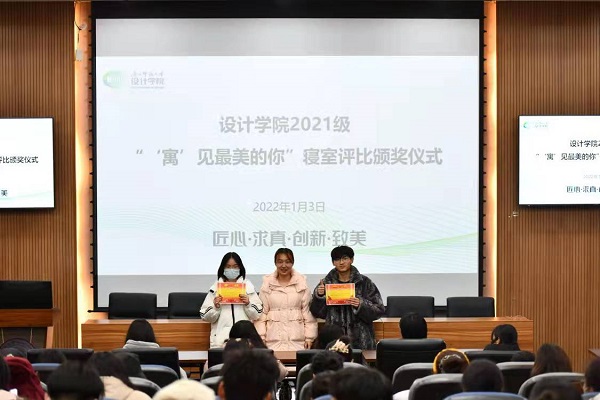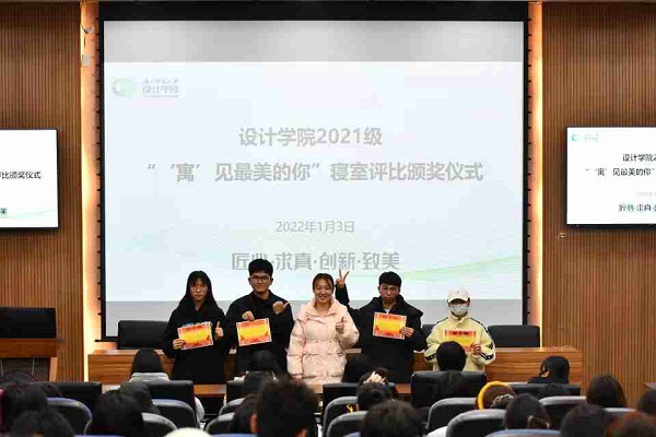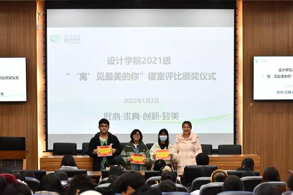 “斯是陋室,惟吾德馨”。寝室是大学生学习、生活的重要场所。为丰富新生寝室文化,增强寝室凝聚力,推进寝室精神文明建设,1月3日,设计学院在纯道楼001报告厅举办2021级本科生“‘寓’见最美的你”新生寝室文化设计大赛颁奖仪式。本次颁奖仪式由2021级本科生专职辅导员主持,2021级全体本科生共同参与。