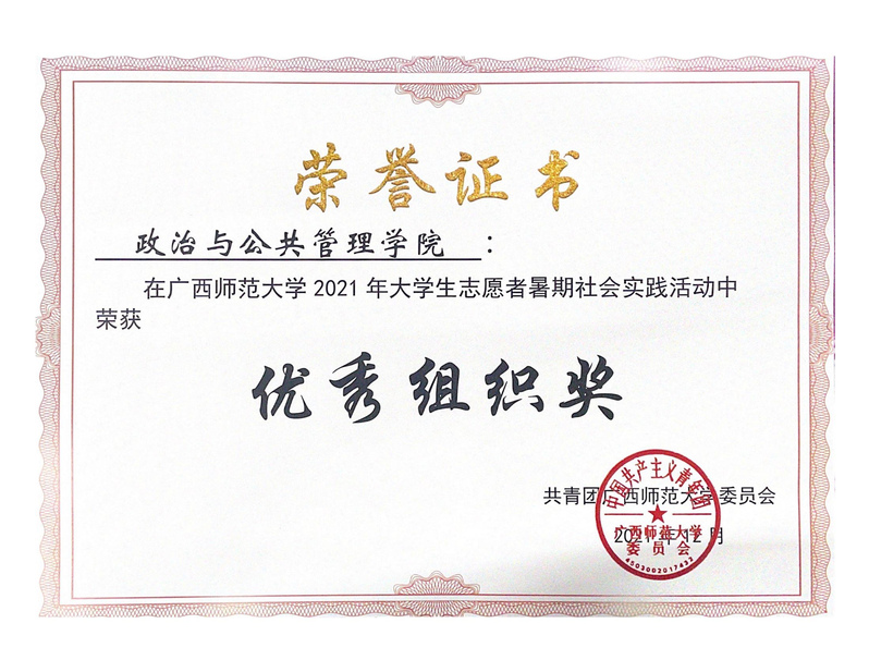 学院团委坚持强化“三全育人”和实践育人作用发挥,优化实践育人机制,将思想政治教育融入社会实践锻炼,为广大团员青年放飞青春梦想、实现出彩人生搭建舞台。在学校2021年大学生志愿者暑期社会实践活动先进集体和先进个人表彰中,学院连续2年获评“优秀组织奖”;学院调研项目“乡村振兴背景下驻村帮扶干部的工作转型困境及应对机制研究——基于广西凌云县的调研与分析”、“民族地区异地搬迁户返贫风险及对策研究——以巴马瑶族自治县Y社区为例”斩获“优秀调研成果奖”一等奖;“湘桂北交界地区社会资本下乡的风险及其治理机制的研究——基于广西灌阳、富川和湖南江永、道县的调查”荣获“优秀调研成果奖”三等奖;志愿服务活动“时刻不忘百年党史,推普助力乡村振兴——暑假燃教育心灯推广国家通用语言文字支教行动”荣获“优秀志愿服务成果奖”三等奖;学院五位老师获评广西师范大学2021年大学生志愿者暑期社会实践活动“优秀指导老师”,学院六位同学获评广西师范大学2021年大学生志愿者暑期社会实践活动“学生先进个人”。