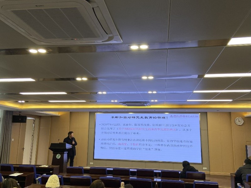 杨秀林详细给同学们阐述学位论文及研究生学术规范:引用规范、署名同意、未发表数据、违反学术规范的行为。通过列举“小保方晴子STAP细胞造假事件”、“翟天临事件”等国内外学术造假的典型案例为同学们敲响警钟,并向同学们深刻讲解了学术不端行为的代价。同时,杨秀林告诫同学们一定不能触碰“学术高压线”,其造成的严重后果不仅直接有损于个人利益,还将给导师和学校“抹黑”,败坏学术风气,实属害己害人行为。杨秀林强调,研究生毕业论文将实行全员“双盲”评选制度,提醒同学们不可投机取巧,要保持严谨治学和求真务实的科研精神,学院和学校层面也将不断加强对研究生学术规范和教育的管理。