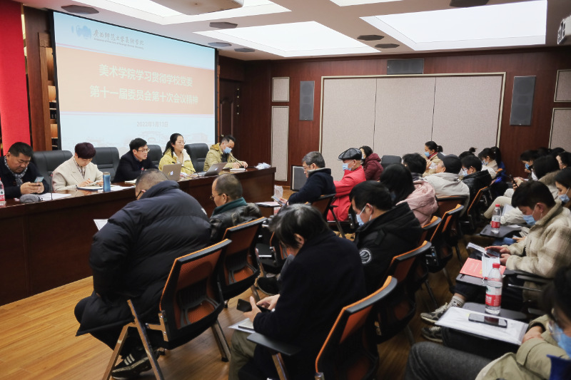 为深入学习贯彻中共广西师范大学第十一届委员会第十次全体会议精神,在2022年伊始,开新局、起好步,聚焦全委会,凝聚全院力量,形成“共建新时代幸福美好师大”共识,1月13日下午,美术学院在育才校区文二楼北楼503会议室召开全体教职工大会。会议由学院党委主要负责人主持。