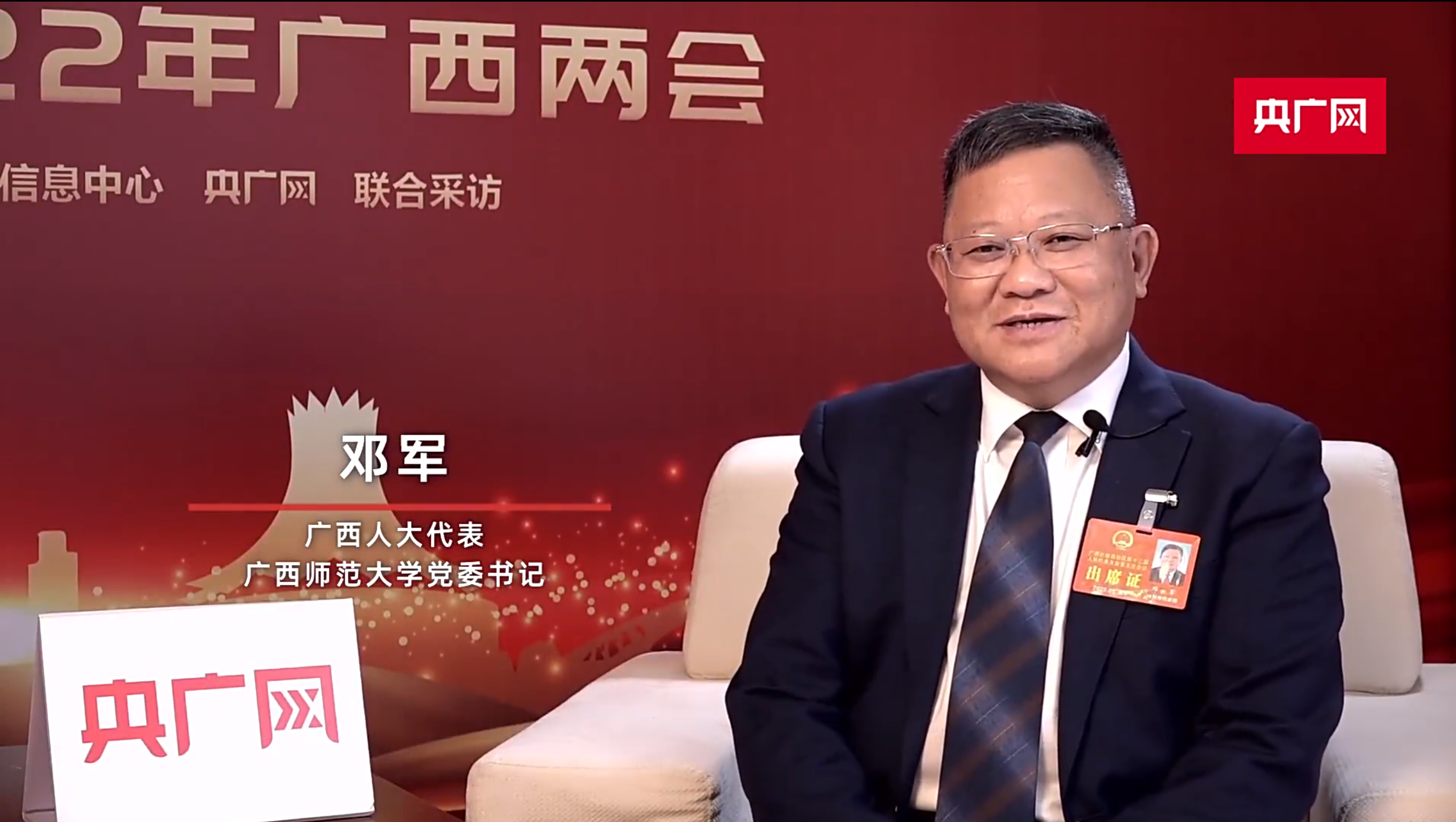1月17日,广西壮族自治区第十三届人民代表大会第五次会议在广西人民会堂开幕。来自全区各条战线的自治区人大代表肩负人民重托出席盛会,依法履行职责。18日,广西人大代表、校党委书记邓军接受央广网《代表谈两会》栏目专访,邓军介绍了我校在加强专业和课程建设、提高教育教学质量等方面取得的新成效与经验做法,分享了“十四五”时期学校建设规划。邓军表示,在“十四五”时期,广西师范大学将紧紧抓住国家推进新时代振兴中西部高等教育的机遇,实施服务建设中国—东盟命运共同体工程,打造面向东盟的教育合作新高地,推动一流大学建设取得扎扎实实的成效。