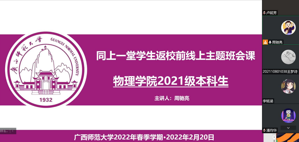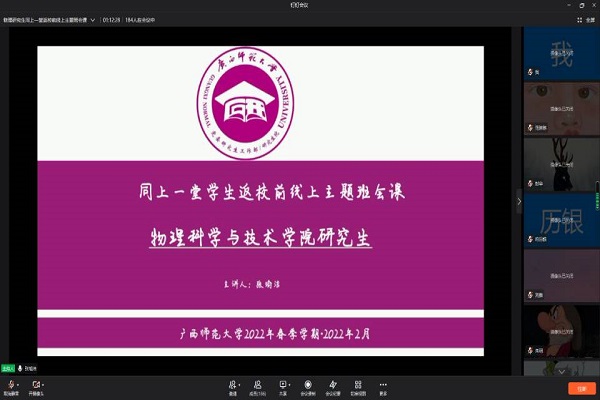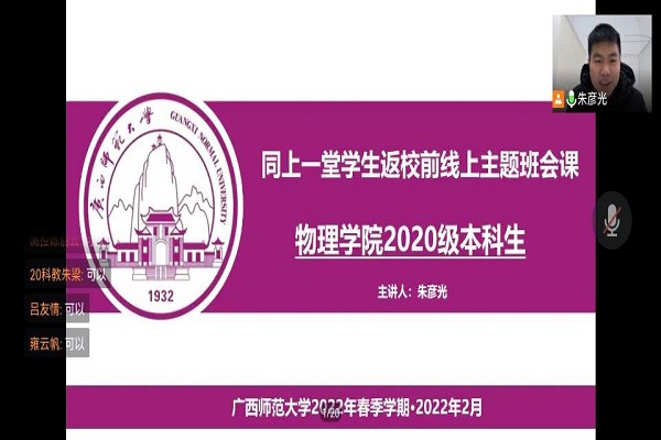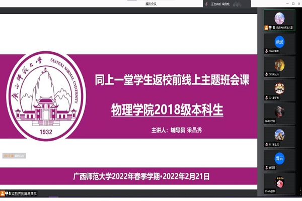 在2021-2022学年春季学期开学之际,为做好新学期疫情防控工作,准确传达学校关于疫情防控期间开学返校的具体部署,确保学生顺利返校,2月19日-2月22日,物理科学与技术学院党委相关负责人与各年级辅导员通过腾讯会议开展“同上一堂学生返校前线上主题班会课”。