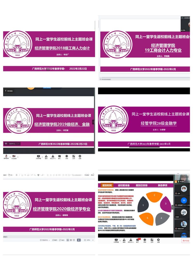 为落实学校疫情防控要求,进一步加强疫情防控期间学生的返校教育,提高同学们返校途中的安全防护意识,做好新学期学生返校的相关准备工作,确保同学们安全返校。近期,经济管理学院各年级、各专业开展了“同上一堂开学返校教育课”线上主题班会。
