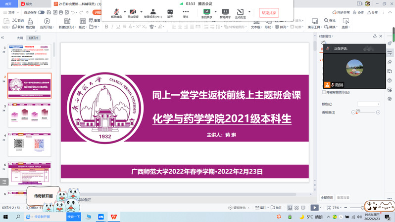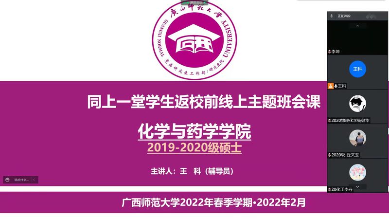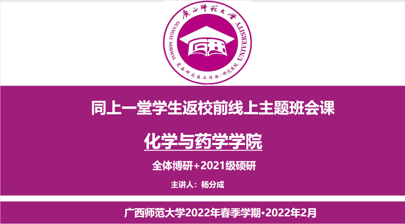 为做好2022年春季学期学生返校工作,落实好学校疫情防控管理措施,切实保障全院学生安全返校工作学习生活,化学与药学学院全体辅导员于2月23日在腾讯会议召开“同上一堂学生返校前线上主题年级会”。
