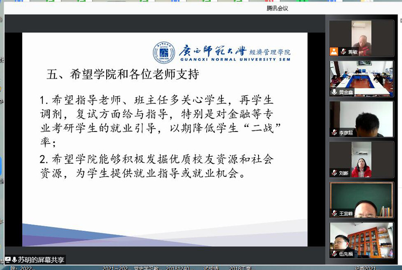 在新冠疫情多发的严峻形势下,为及时总结寒假工作情况,推进下一步就业工作,新学期开学前夕,经济管理学院于2月26日先后在育才校区第二文科楼712会议室召开党政联席会、通过腾讯会议召开全院教职工线上会议,专题研究2022届毕业生就业工作,进一步提高认识,统一思想,凝聚合力破解难题。