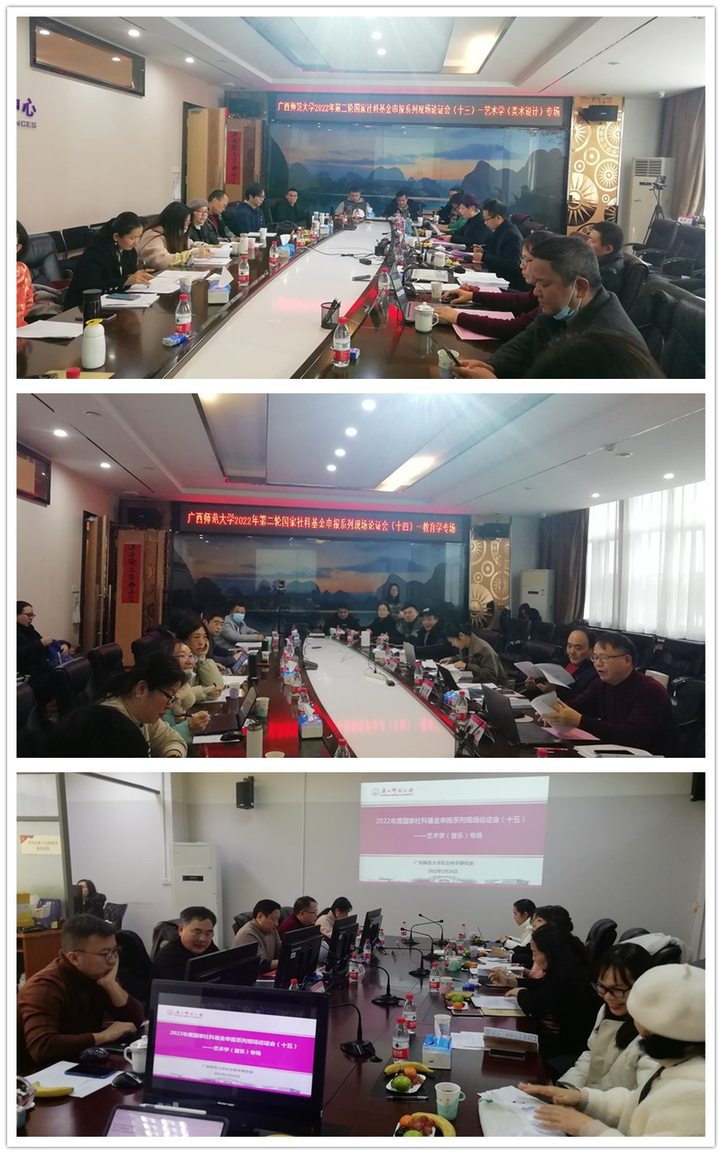 为进一步提高我校国家社科基金申报质量,帮助申报老师进一步掌握申报技巧和要领,我校进一步加强与区内外兄弟院校及科研院所的沟通和联系,邀请了武汉大学、厦门大学、华南理工大学、暨南大学、云南大学、华南师范大学、浙江师范大学、宁波大学、江西财经大学、湖南师范大学、南华大学、广西大学、广西民族大学、广西艺术学院,以及中国社会科学院、上海社会科学院等16所高校、科研院所共18位校外专家,以及19位校内专家,莅临现场或通过线上与我校申报老师深入交流课题论证修改方案。