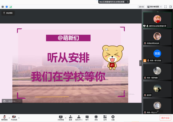 临近开学,为进一步做好新冠肺炎疫情防控和春季学期开学工作,2月17-25日,外国语学院各年级陆续组织开展同上一堂返校前线上主题班会课,会议由各年级辅导员主持。