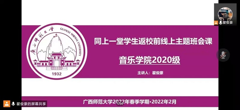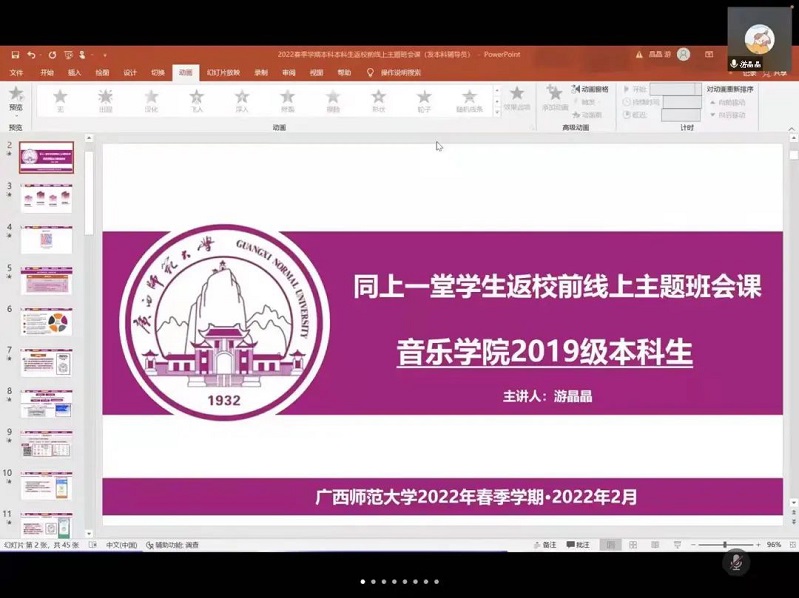 音乐学院高度重视当前疫情防控下的学生开学返校工作,要求全体师生从严、从实、从细做好开学前的各项准备工作。此次线上会议帮助学院学生全面熟悉返校的相关事宜,切实做到学校疫情防控要求全员知晓、全员配合、全员落实,从而确保学生开学返校的各个环节顺利推进,师生携手同行,合力筑牢安全防线,共创安康和谐的校园学习生活环境。
