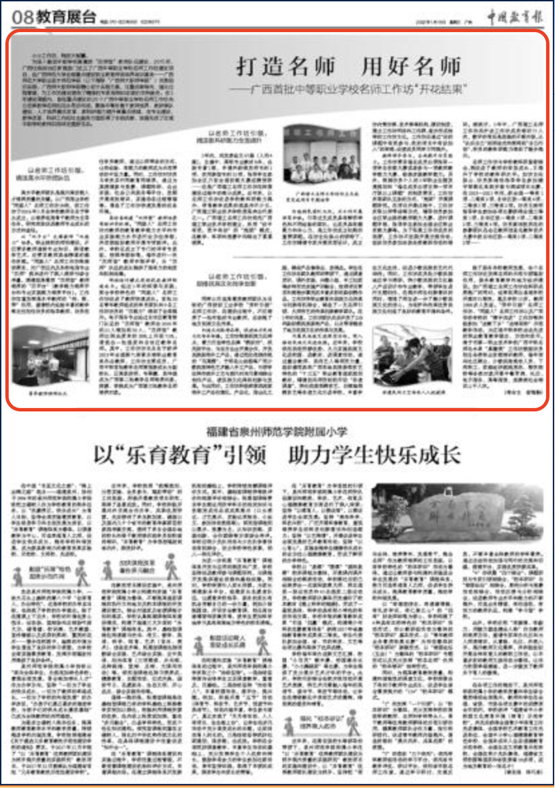 2022年1月19日,中国教育报以《打造名师 用好名师——广西首批中等职业学校名师工作坊“开花结果”》为题,关注报道由广西师范大学全国重点建设职业教育师资培养培训基地——广西师范大学职业技术师范学院负责组织实施的广西首批中等职业学校名师工作坊取得了丰硕成果。