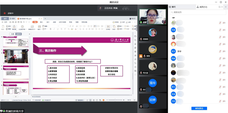 会上,嘉宾们重点强调了以下四个方面的内容:一是在个人简历制作方面,建议同学们要结合专业要求,突出个人的学术优势以及相关的实践经历,学会扬长避短;二是在复试准备过程中,同学们要做好复习规划和时间安排,保持良好的学习状态和节奏,注意关注专业领域的研究前沿,适当进行英语口语问答的模拟练习;三是在复试过程中,同学们应体现谦卑好学的态度,回答问题分层分点、逻辑清晰、保持礼貌,并提醒同学们线上复试时要保持稳定的网络与安静的环境;四是在调剂方面,同学们要提早准备,主动查找并及时关注目标院校发布的相关信息,大胆地与老师、前辈沟通交流,不轻言放弃。此外,嘉宾们还就心态调整、面试礼仪等给予了宝贵建议。