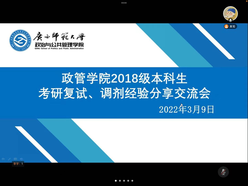 为解决政管学子关于考研复试以及调剂等方面的困难和困惑,助力政管学子考研成功,3月9日,政管学院借助腾讯会议平台,以线上会议的形式顺利举行了2022届考研复试、调剂经验分享交流会。会议邀请2021届考研成功的五位学子为政管学院2018级考研学生作经验分享。他们针对本专业考生、跨专业考生、跨学校考生和将选择调剂的考生所关心的复试流程、备考经验、注意事项、调剂信息收集等多项问题进行了详细讲解,并结合个人的心路历程分享了满满干货。