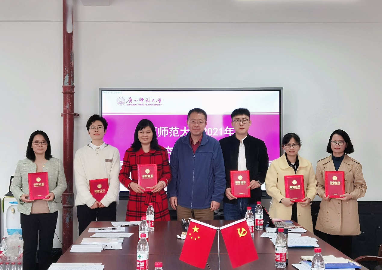 会议第一阶段,为获得2021年度广西师范大学优秀研究生教学秘书荣誉称号的六位研究生教学秘书颁奖。研究生院负责人为受表彰的优秀研究生教学秘书颁发荣誉证书,并向所有受表彰者表示衷心祝贺。