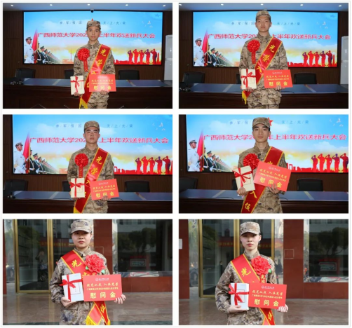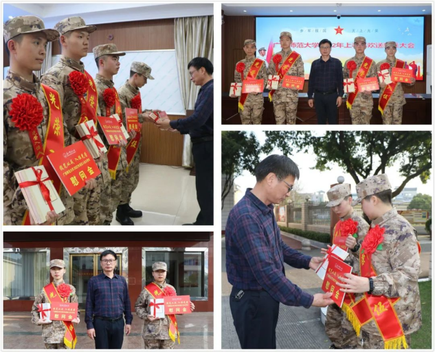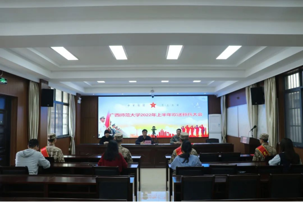 3月15日,我校在桂林市秀峰区武装部、桂林警备区分别为2022年春季从学校光荣应征入伍的4名男大学生和2名女大学生举行了入伍欢送仪式。校武装部、学生工作部(处)相关负责人、入伍学生所在学院辅导员和桂林警备区、秀峰区武装部领导出席欢送仪式。