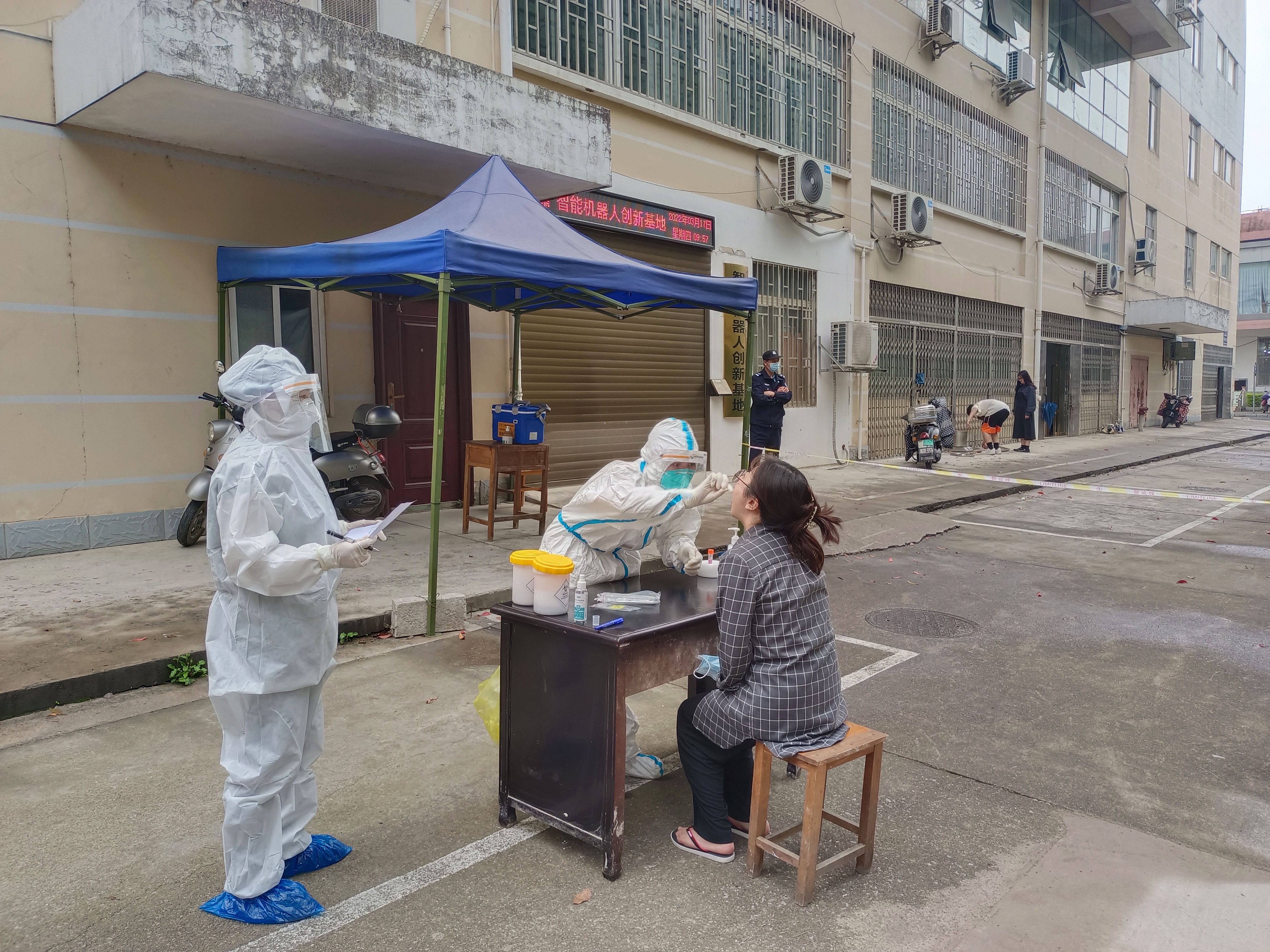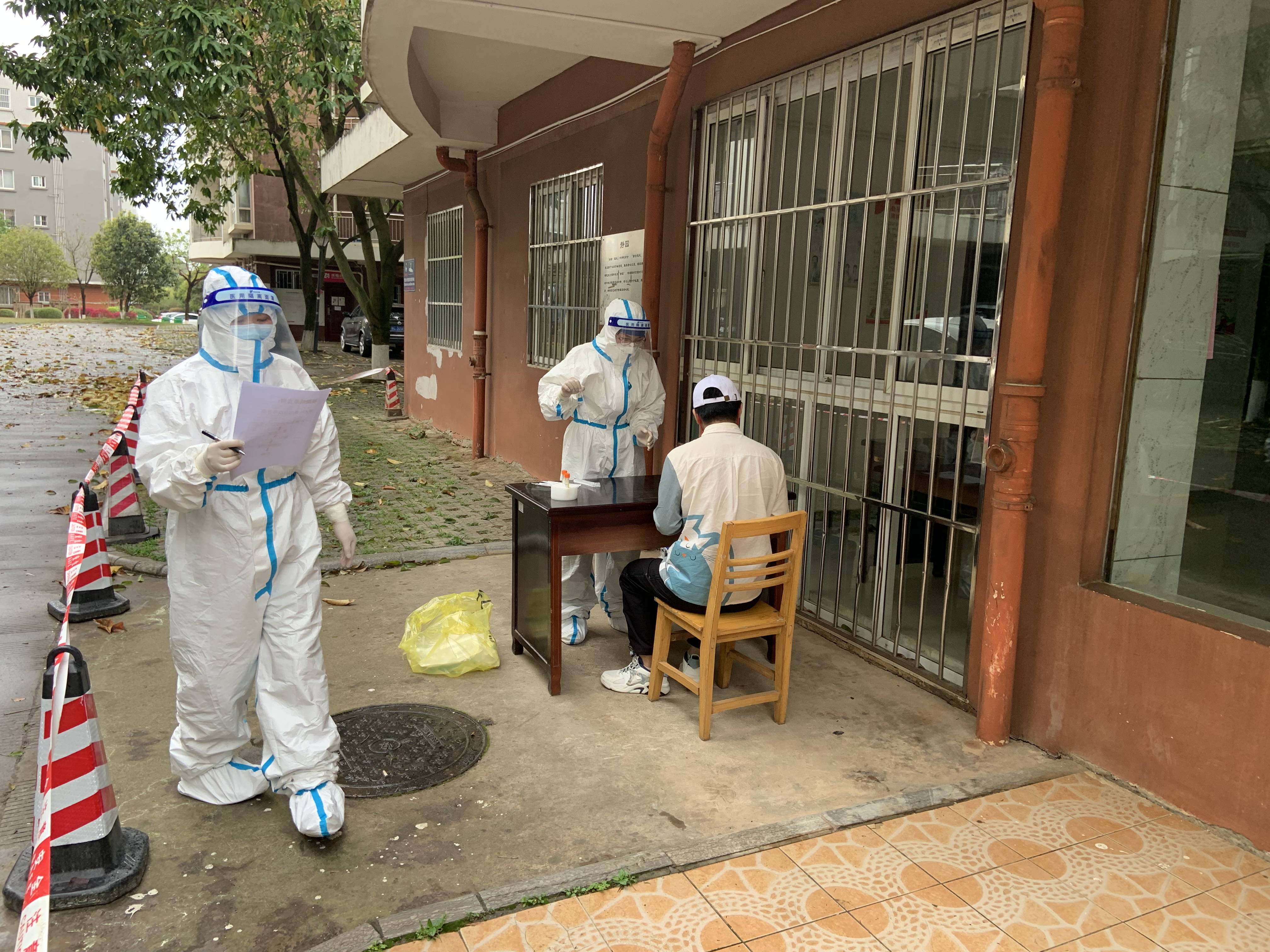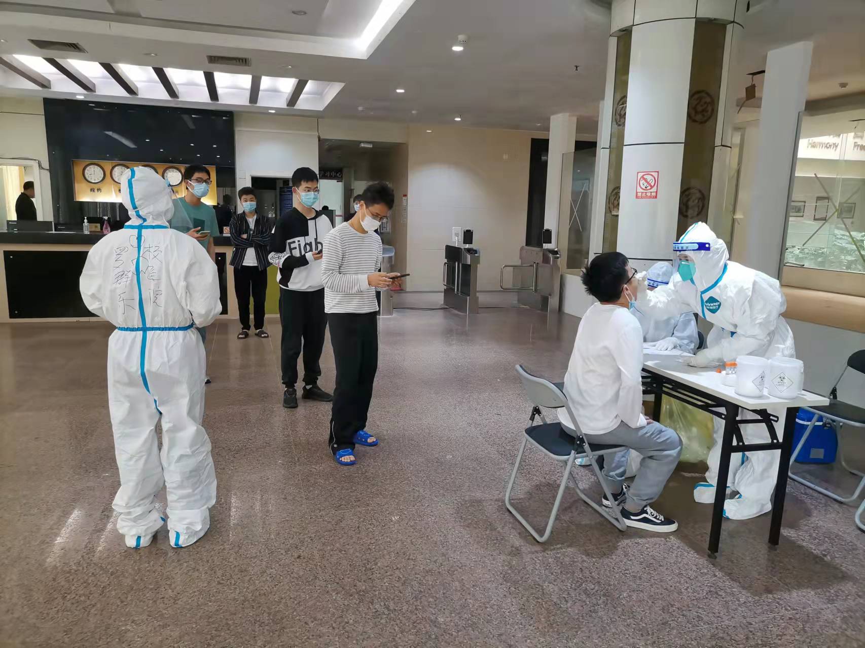 医务人员为校内隔离区隔离人员采样中