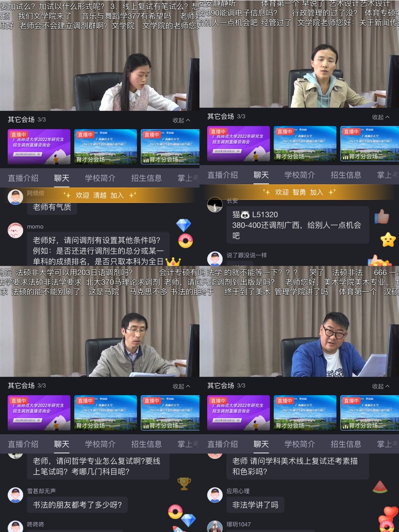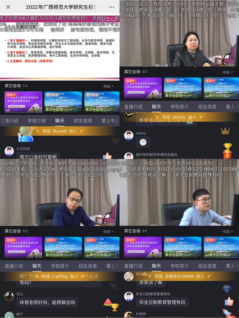 为满足广大考生咨询需求,搭建考生与院校无障碍沟通桥梁,增进同学们对广西师范大学2022年研究生招生复试调剂政策的了解,研究生院积极谋划,创新宣传方式,联合中国教育在线于3月18日举办了“广西师范大学2022年研究生招生复试调剂直播咨询会”活动,校内20个研究生培养单位齐聚直播间,以视频直播的互动方式向考生和家长介绍学院基本情况和研究生招生专业等相关咨询,充分发挥自媒体时代信息传播快速迅捷的特点,创新了研究生招生的宣传方式,强化了我校招生拓展的宣传效果,以建立高效立体的咨询渠道,提升“云端”咨询服务的水平和质量。