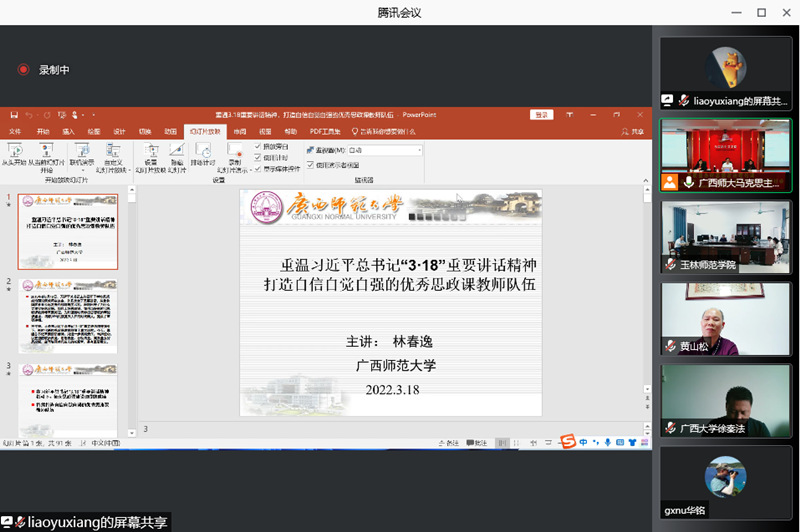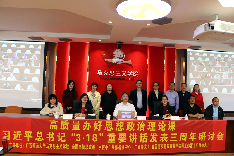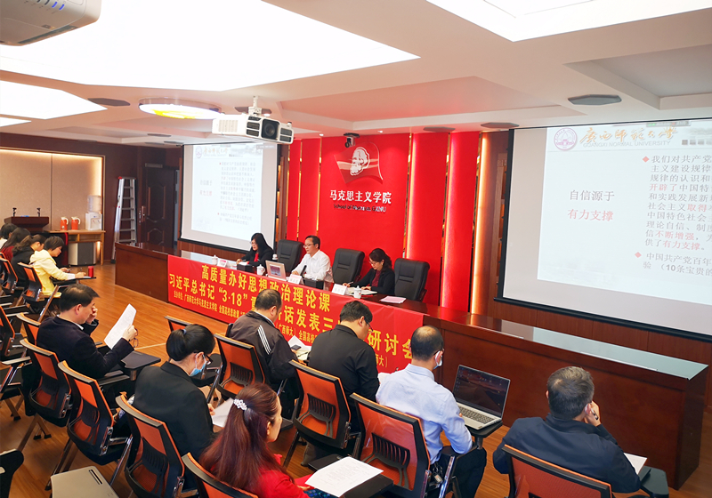 3月18日下午,我校在育才校区举办“高质量办好思想政治理论课——习近平总书记‘3•18’重要讲话发表三周年研讨会”,本次研讨会由我校马克思主义学院、全国高校思想政治理论课“手拉手”集体备课中心(广西师范大学)和全国高校思想政治理论课教学名师工作室(广西师范大学)主办。会议严格遵守疫情防控相关要求,以现场会议和线上会议相结合的方式同步进行。广西大学、广西民族大学、南宁师范大学、桂林理工大学、广西科技大学、玉林师范学院、桂林航天工业学院、桂林师范高等专科学校、广西机电职业技术学院等区内多所高校马克思主义学院主要负责人及200余名思想政治理论课教师代表参加了研讨会。