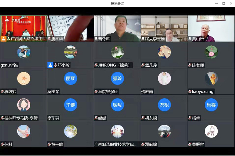 广西大学马克思主义学院院长徐秦法教授做了题为“围绕立德树人根本任务创新思想政治理论课教学方式”的主题报告,他结合广西大学思政课教学改革创新实践,从“知识点+案例”的教考模式、“课堂教学+实验教学”的教学模式、“实践教学+协同育人”的育人模式等方面,同与会思政课教师进行了分享。南宁师范大学马克思主义学院院长曾令辉教授认为,科学把握“大思政课”的本质,必须要清晰把握并厘清“大思政课”的内涵、外延、特性、基本矛盾与规律等问题。广西民族大学马克思主义学院院长李玉雄教授在谈到如何通过实践教学来提升思政课的时效性时,他重点介绍了该校“读·悟·讲·演”的思政课实践教学改革经验。此外,广西科技大学马克思主义学院院长黄山松教授、广西机电职业技术学院马克思主义学院院长黄振宣教授、广西师范大学马克思主义学院常务副院长韦冬雪教授还结合各校开展思政课教学改革的做法和经验,分别做了题为“深耕思政课程责任田,构建立德树人新格局”、“高职院校思想政治理论课教学特质及实践”、“广西高校思想政治理论课教学质量‘整体提升’的实践与思考”的主题报告,为更好地推动新时代我区高校思政课建设守正创新建言献策。