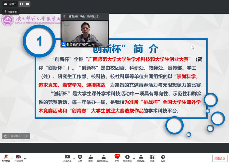 学院负责创新创业工作的指导老师详细介绍创新创业类学术科技竞赛的类别、参赛要求和我院近年来的竞赛成绩,重点介绍“互联网+”大学生创新创业大赛、大学生创新创业训练计划项目和“创新杯”大学生课外学术科技竞赛。第七届中国国际“互联网+”大学生创新创业大赛“数广集团杯”广西赛区选拔赛铜奖项目《数学课栈——赋能中西部乡村数学教育振兴》团队成员展示项目成果,并从“主动”、“行动”、“感动”三个方面分享参赛心得。