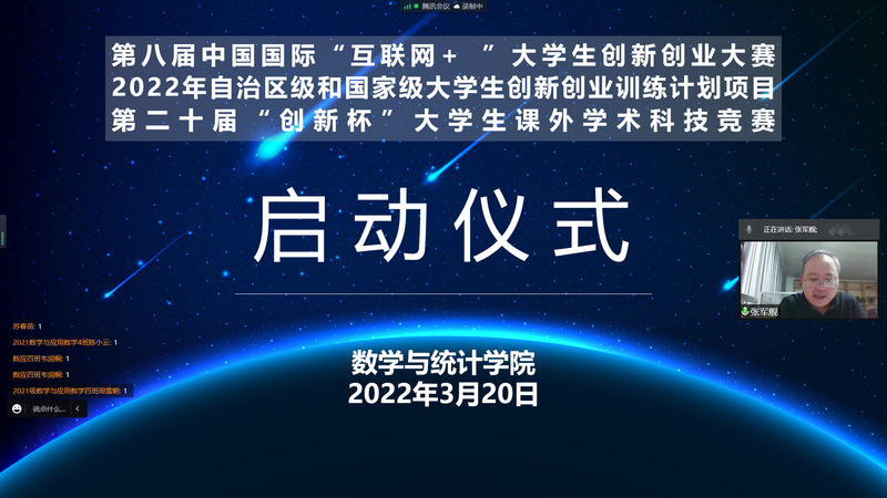 为营造浓厚的校园学术科技氛围,深入推进大众创业万众创新,切实提高学生的创新精神、创业意识和创新创业能力,3月20日,数学与统计学院通过线上会议的方式举行2022年创新创业类学术科技竞赛启动仪式,全面启动新创业类学术科技竞赛。学院行政负责人、党委相关负责人、团委负责人、专职辅导员和400余名学生代表参与本次启动仪式。