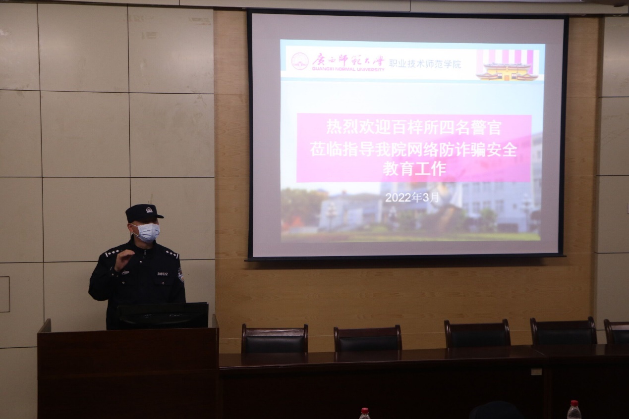 为进一步做好防范校园电信网络诈骗工作,有效预防和遏制网络诈骗案件的发生,提高全院同学自觉防范网络诈骗意识,减免重大财产损失,3月30日,职业技术师范学院特邀桂林市秀峰区百梓派出所的四名民警莅临学院407会议室指导网络防诈骗安全教育工作。