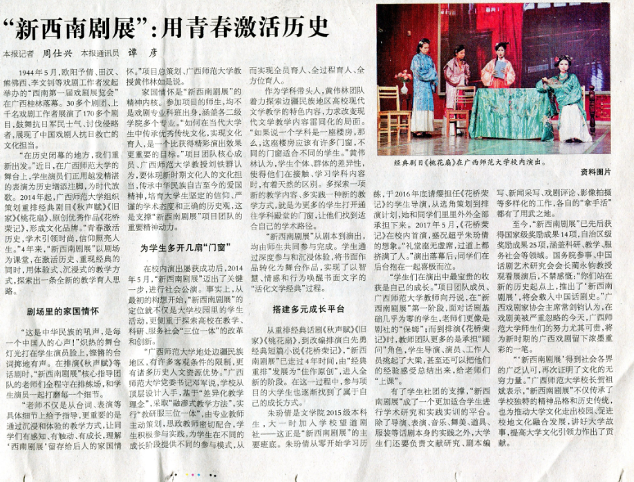 近年来,文学院/新闻与传播学院党政高度重视望道系列社团建设,指导老师和社员齐心共建,将社团活动作为思政教育鲜活的载体和路径,将思政元素有效融入第二课堂,多维助推学院学生人文素养和专业能力的提升,其中《以新西南剧展为核心的美育改革》案例在全国第六届大学生艺术展演活动中获一等奖,是全区唯一获一等奖的优秀案例,育人效果显著。
